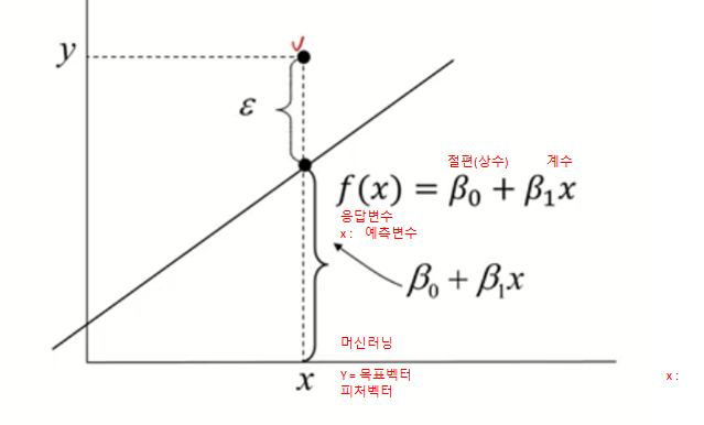 잔차 : 모든 데이터가 정확히 한 직선 안에 들어오지 않기 때문에 오차항 포함