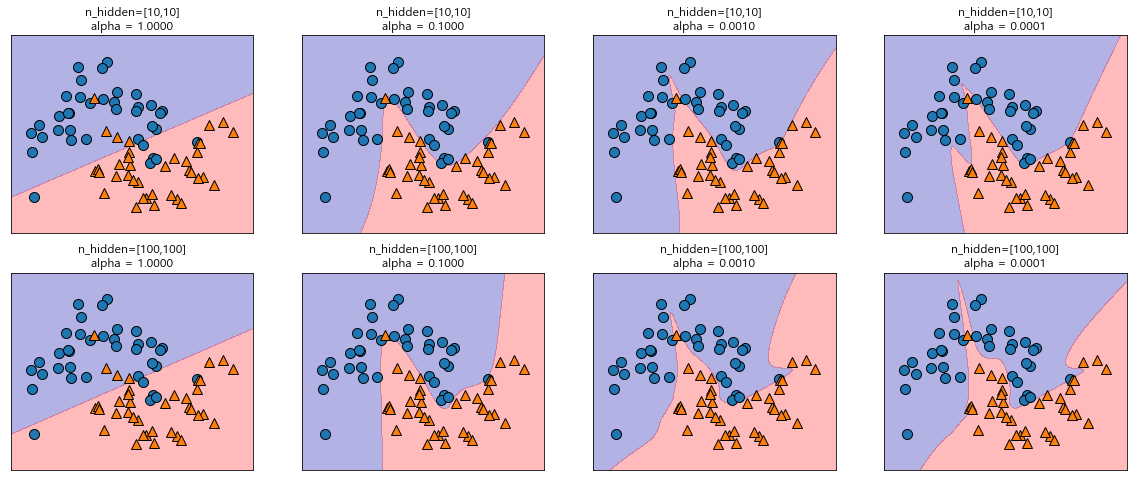 규제를 많이주면 산처럼 변하고 안주면 과적합됨import matplotlib.pyplot as plt # 시각화 할때 fig, axes = plt.subplots(2,4,figsize = (20,8)) for axx, n_hidden_nodes in zip(axes, [10,100]): for ax, alpha in zip(axx, [1,0.1,0.001,0.0001,0.00001]): # alpha 는 규제값임 mlp = MLPClassifier(solver='lbfgs', random_state=0, activation = 'tanh', hidden_layer_sizes=[n_hidden_nodes, n_hidden_nodes], alpha=alpha) mlp.fit(X_train,y_train) mglearn.plots.plot_2d_separator(mlp, X_train, fill=True, alpha=.3,ax=ax) mglearn.discrete_scatter(X_train[:,0], X_train[:,1], y_train,ax=ax) ax.set_title("n_hidden=[{},{}]\nalpha = {:.4f}".format(n_hidden_nodes, n_hidden_nodes, alpha))