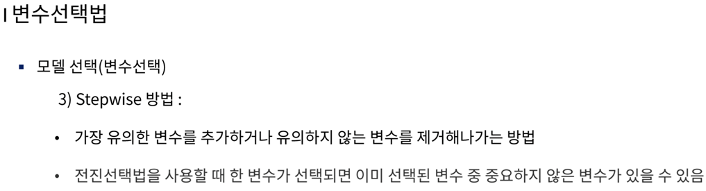 전진선택법의 각 단계에서 이미 선택된 변수들의 중요도를 다시 검사 하여