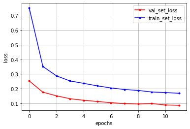 import numpy as np y_vloss = history.history['val_loss'] y_loss = history.history['loss'] x_len = np.arange(len(y_loss)) plt.plot(x_len, y_vloss, marker='.', c='red', label='val_set_loss') plt.plot(x_len, y_loss, marker='.', c='blue', label='train_set_loss') plt.legend() plt.xlabel('epochs') plt.ylabel('loss') plt.grid() plt.show()