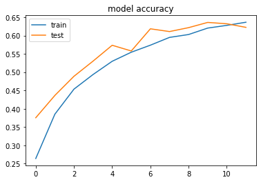 # 1. accuracy graph를 출력 # 2. 이미지 cat, dog를 다운로드한 다음 위의 모델로 예측 plt.plot(history.history['accuracy']) plt.plot(history.history['val_accuracy']) plt.title('model accuracy') plt.legend(['train', 'test'], loc = 'upper left') plt.show()