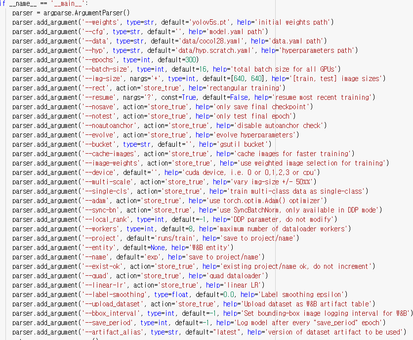 img size, batch size, epochs, data 위치, config 파일위치, 가중치파일, 저장될 파일이름입니다.
