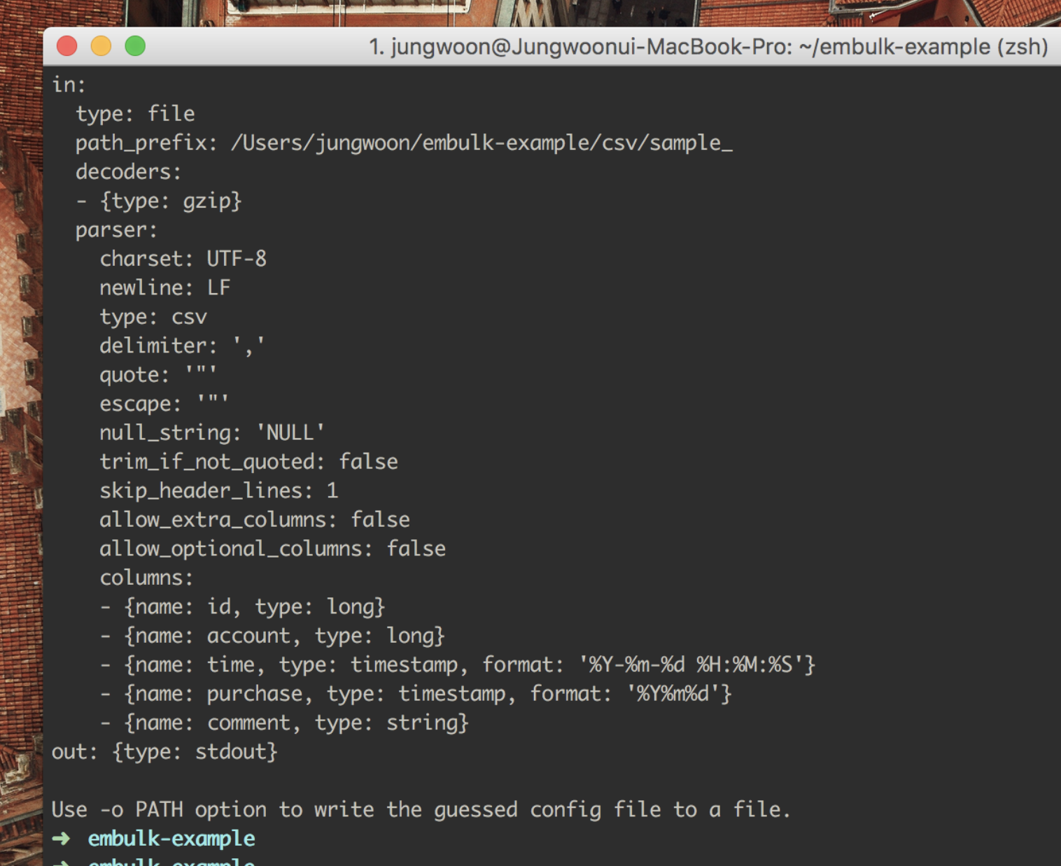 in: type: file # file 타입의 파일 여기서는 csv 파일 path_prefix: "/Users/jungwoon/embulk-example/csv/sample_" # csv 파일 경로 out: type: stdout # stdout은 그냥 화면 출력yml이 만들어졌으면 embulk guess란 명령으로 해당 데이터에 대한 추론이 가능할뿐아니라 자동으로 설정까지 만들어 줍니다 일단 아래 명령어를 통해 seed.yml에 대해서 확인을 해봅니다.
