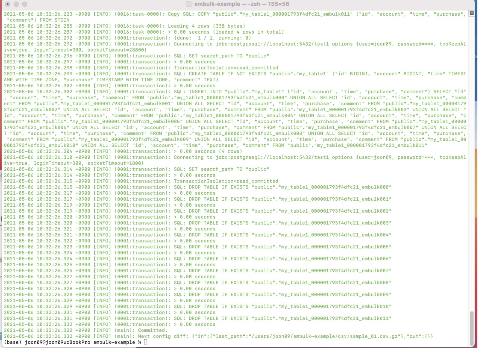 in: type: file path_prefix: /Users/joon09/embulk-example/csv/sample_ decoders: - {type: gzip} parser: charset: UTF-8 newline: LF type: csv delimiter: ',' quote: '"' escape: '"' null_string: 'NULL' trim_if_not_quoted: false skip_header_lines: 1 allow_extra_columns: false allow_optional_columns: false columns: - {name: id, type: long} - {name: account, type: long} - {name: time, type: timestamp, format: '%Y-%m-%d %H:%M:%S'} - {name: purchase, type: string} # timestamp가 들어가면 에러가 나서 String으로 바꿔줌 - {name: comment, type: string} out: type: postgresql host: localhost port: 5432 user: dbuser password: "" database: test1 table: my_table1 mode: insert설정이 끝났으면 embulk를 실행해주면 데이터가 이동됩니다.