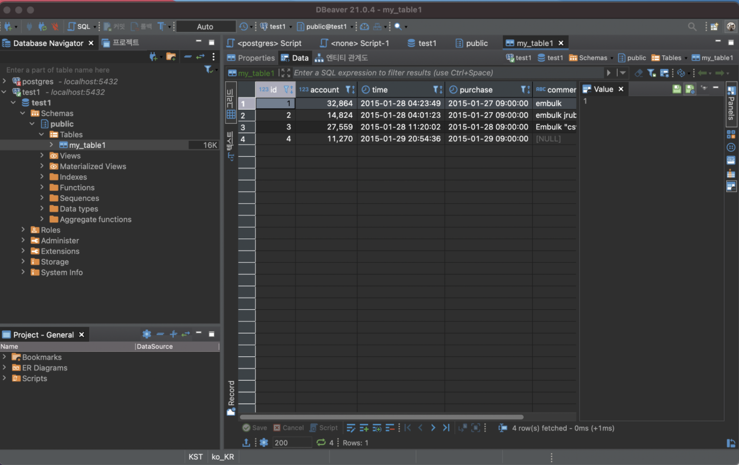 실제 dbeaver를 이용해서 로컬 db에 접속을 하면 입력이 완료된 것을 확인할 수 있습니다.