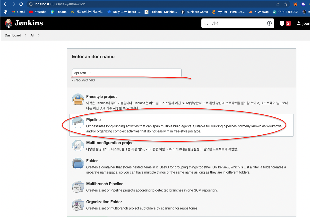 jenkins에서 프로젝트를 생성해줍니다.