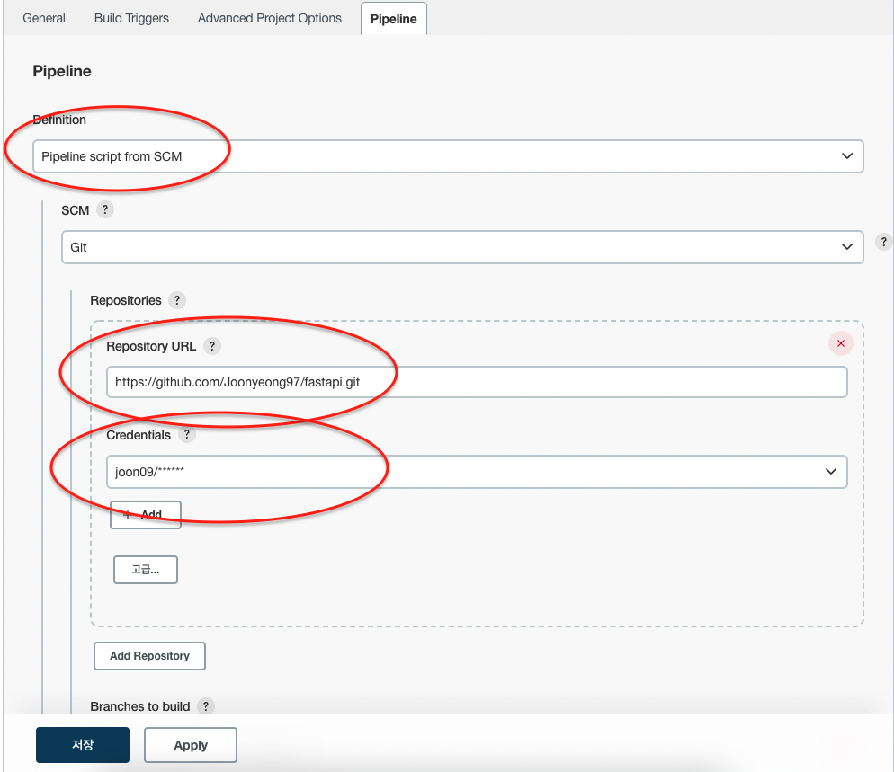 이번엔 pipeline 탭에서 Definition 에 Pipeline script from SCM 클릭