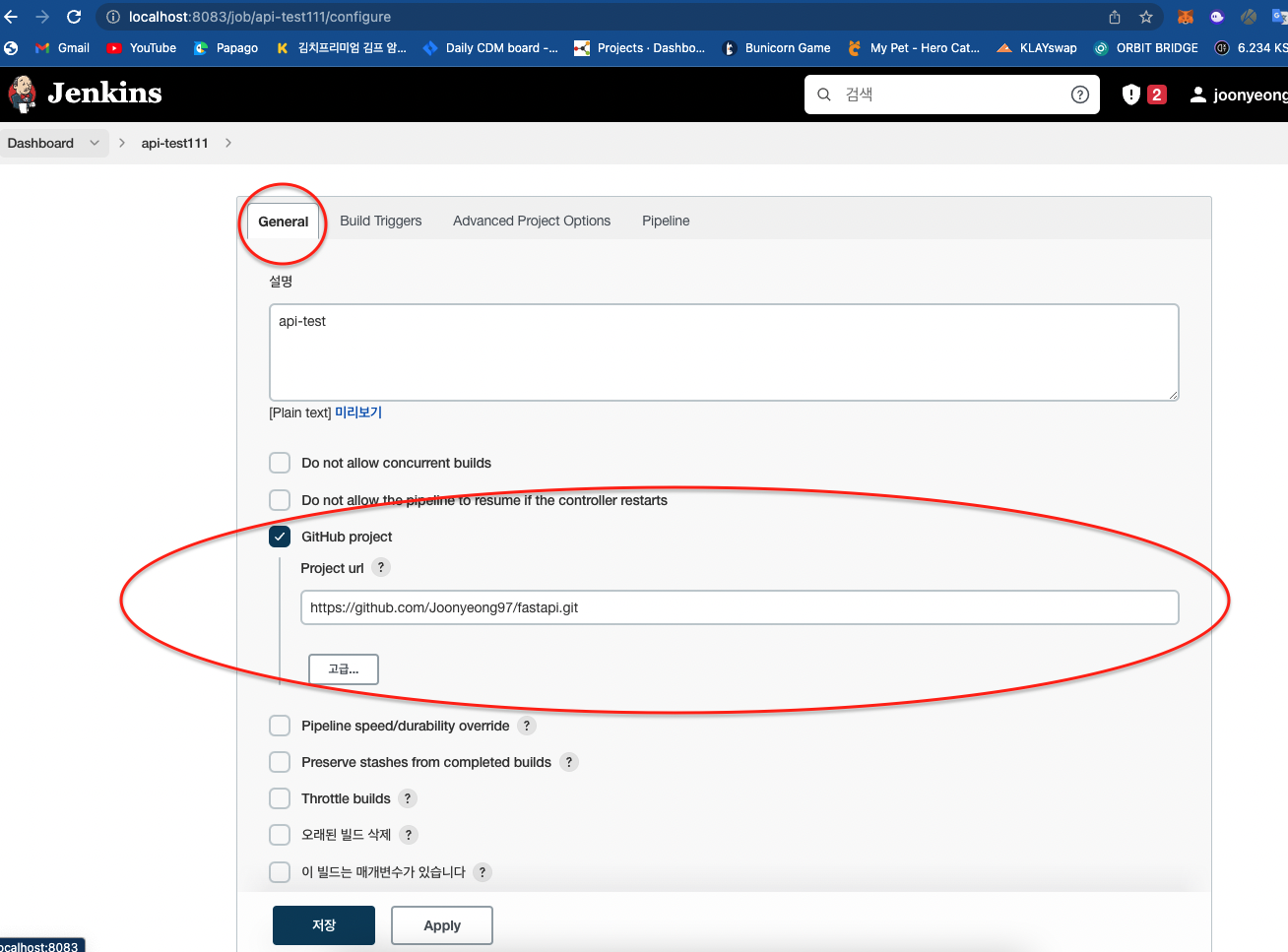 그리고 본인의 git project url을 넣어줍니다.