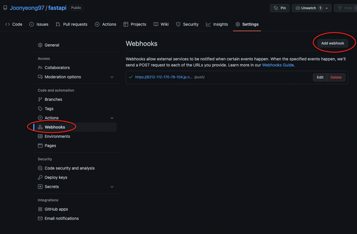 Webhooks -> 오른쪽 위에 Add webhook 클릭