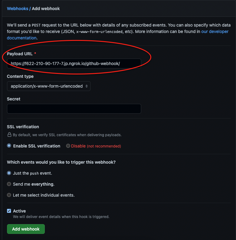 위에서 발급한 주소와 뒤에 path에 /github-webhook/ 을 꼭 붙여주세요.