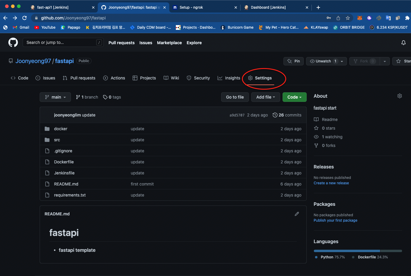 Jenkins pipeline 만들어서 배포하기(Python FastAPI 배포 환경 구축 - 2) (1) 2022.07.31 Github 개발자용 Secret key 발급 방법 (jenkins Credentials 생성) (0) 2022.07.31 Jenkins Docker-compose로 시작하기 (Python FastAPI 배포 환경 구축 - 1) (0) 2022.07.29